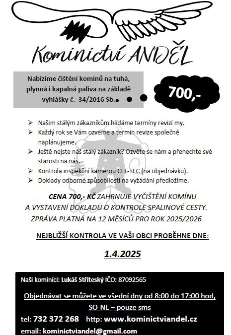 Na základě vyhlášky č. 34/2016 Sb. nabízíme čištění komínů na tuhá, plynná a kapalná paliva. Naši stálí zákazníci mají výhodu v hlídání termínů revizí, které společně plánujeme. Cena 700,- Kč zahrnuje vyčištění komínu a vystavení dokladu o kontrole spalinové cesty, platného na 12 měsíců pro rok 2025/2026.